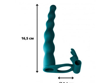 Strap-on para doble penetración Bunny fabricado en silicona hipoalergénica. Con relieve y forma flexible. Se puede colocar en la raíz del pene mediante cock ring. El diámetro interior del anillo - 3,1см. Se estira bien y se adapta a cualquier tamaño. Estimulación adicional se lleva a cabo por medio de la vibrobullet con 10 modos. Funciona con 1 pila AAA (no incluida). Puede extraerse fácilmente de la funda de silicona y utilizarse por separado. El vibrobullet de la parte superior está hecho para la estimulación del clítoris, funciona con pilas tipo tableta (incluidas).